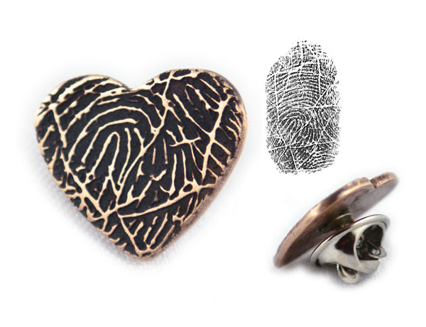 Put a loved ones digital or ink print fingerprint on a symmetrical heart pure bronze pin.