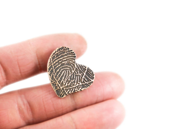 Put a loved ones digital or ink print fingerprint on a whimsical heart pure bronze pin.